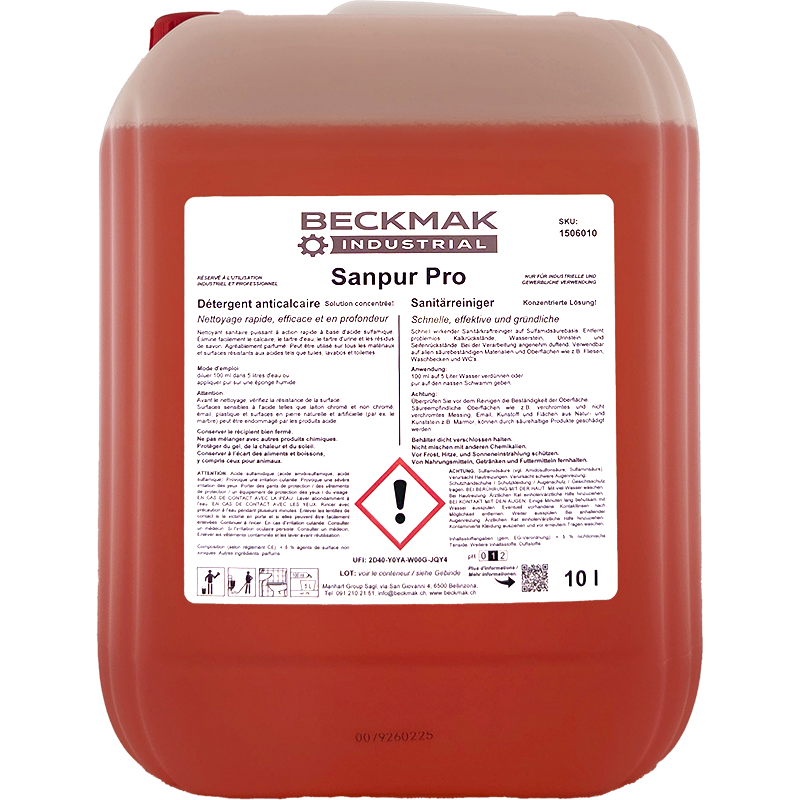 Der Sanpur Pro Sanitärreiniger ist ein leistungsstarker, schnell wirkender Reiniger für die tägliche Unterhaltsreinigung in Dusch- und Sanitärbereichen. Die saure Formel auf Sulfaminsäurebasis entfernt zuverlässig Kalk, Urinstein, Seifenreste und Wasserflecken und sorgt für hygienische Sauberkeit und strahlende Oberflächen.